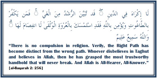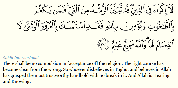 From an early age, people hear certain ideas mentioned and without reflecting over them or verifying them in any way, they begin to believe in them. The verse (supposedly) reads in part, let there be no compulsion in religion; Intention and volition are necessary bases of all actions (including formal worship), attitudes, and thoughts for which the individual is religiously accountable. From an early age, people hear certain ideas mentioned and without reflecting over them or verifying them in any way, they begin to believe in them. Verse 2:256 from the quran is often quoted to prove what a tolerant religion islam is. 256) "there shall be no compulsion in acceptance of the religion". They came to the prophet pbuh asking whether they could force their children to become muslims to which the prophet (pbuh) replied with this verse. They came to the prophet pbuh asking whether they could force their children to become muslims to which the prophet (pbuh) replied with this verse.